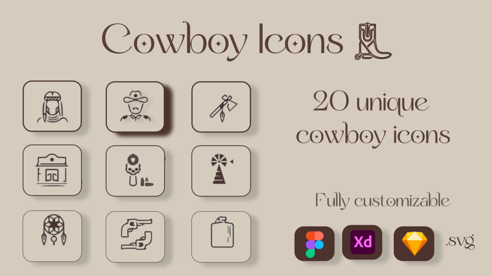 A collection of 20 unique cowboy icons for Adobe XD, Figma and Sketch , making it easy to explore and find the glyphs you may be looking for.